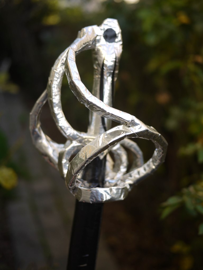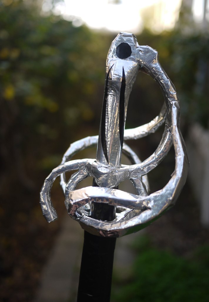 This is really my crowning achievement in terms of lightness. The whole thing is about 3 feet long, and weighs 4 and a half ounces (just over a quarter of a pound). And half of that is in the handle. I’m quite serious about using all sorts of engineering tricks to make props safe through being very light, while remaining sturdy.