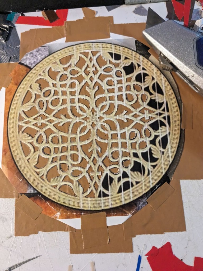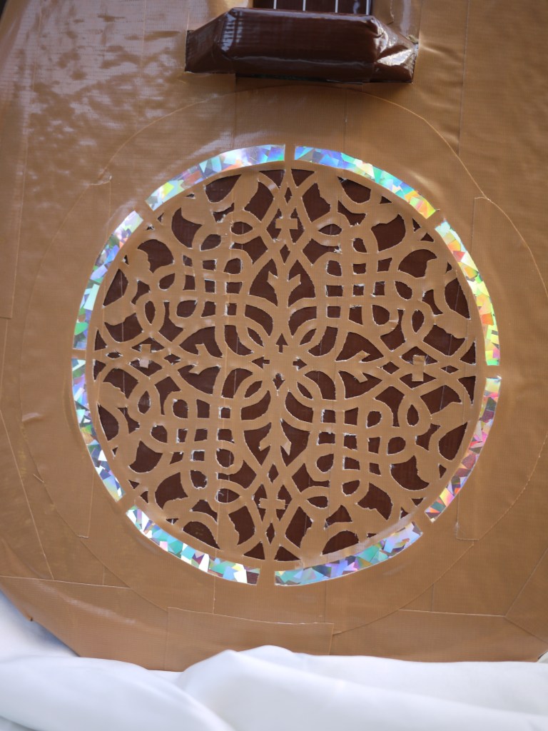 The decoration is based upon this design by Lutes & Guitars, but carved from two colors of duct tape. The surrounding opalescent circle is an addition of mine, using a sheet of reflective crystal-patterned plastics, inspired by the way many modern guitars have a mother-of-pearl circle. This is quite the undertaking — while I was in the middle of carving out the pattern, I messaged my sibling a picture with the caption “my hand hurts.”