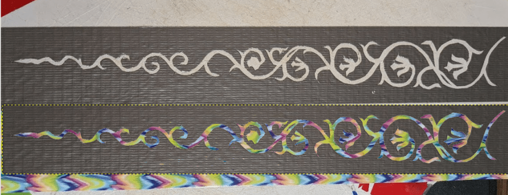 The below is from when I took a picture of the cut-out grey layer lying next to a piece of the rainbow tape, then digitally superimposed one upon the other to check how it would look.
