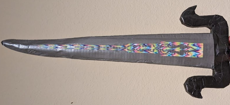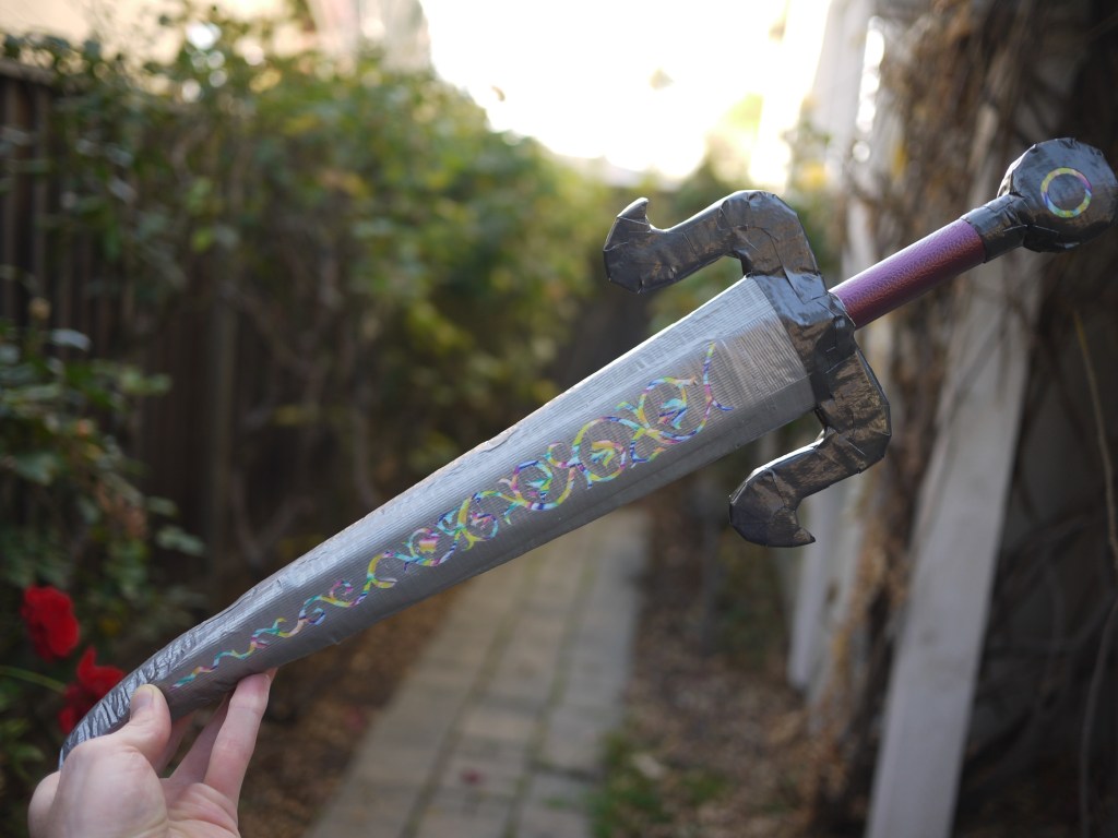 The design of the handle I made is totally free-handed, just going for something that would look like the right balance of real and whimsical. The blade having such a wedge shape to it I think enhances the feeling that it’s some kind of ceremonial or special dagger (In duels there’s not as much need to make such a wide cut). The handle is wrapped in purple faux leather, and the pommel has some clever padding tricks so that it can knock into people safely. The tip having a slight curve to it also means it’s fine to stab with, since the foam all deforms and squishes in the direction of the curve.