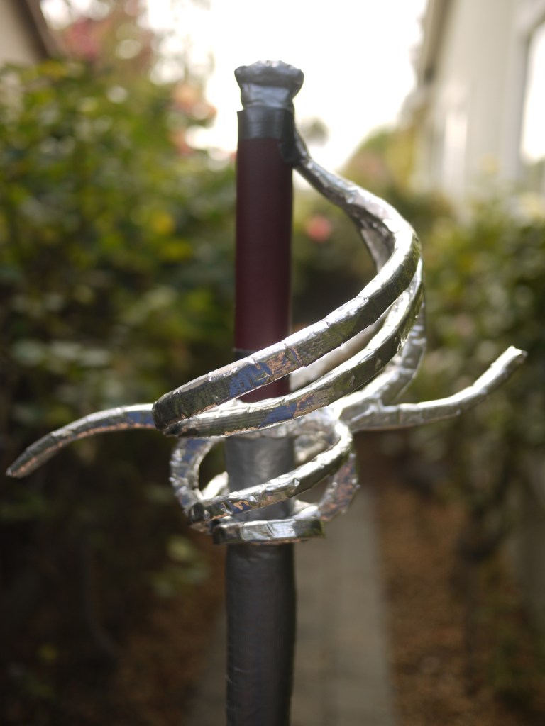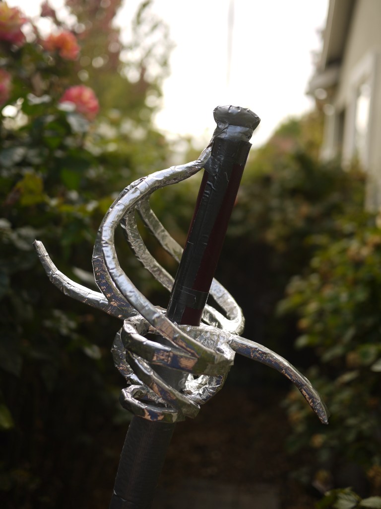 The handle is faux leather from FabMo, which takes donations of spare fabrics left over from trade shows that would otherwise be unused. It gives a nice firm grip, not so soft as to make it difficult to twirl, nor so hard that it’s difficult to get traction. The entire structure of the chrome elements — the cross-guard, knuckle guard, loop-guards, side-rings, and counter-guards — are constructed out of the same low-density polyethylene foam that blades are often made out of, so that it squishes if pressed. The ricasso (the two-inch part of the “blade” between the cross-guard and the rest of the blade, which is left unsharpened because that’s where your thumb and index finger grip it) also has the faux leather in it, so that the grip remains strong.