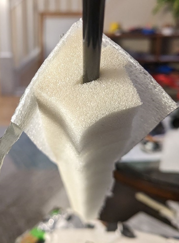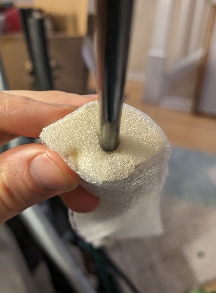 Originally I made this with a carbon fiber rod as the core because I didn’t have any tubes at the time, but, as expected, that added unnecessary weight, so I replaced it with a hollow tube that weighs less than 2 ounces. The entire rapier is now 9.6 ounces, 60% of one pound, and much of that is in the handle.