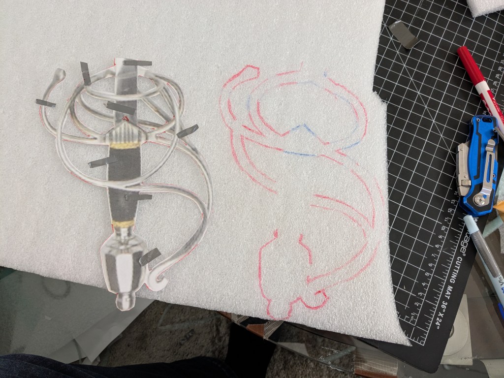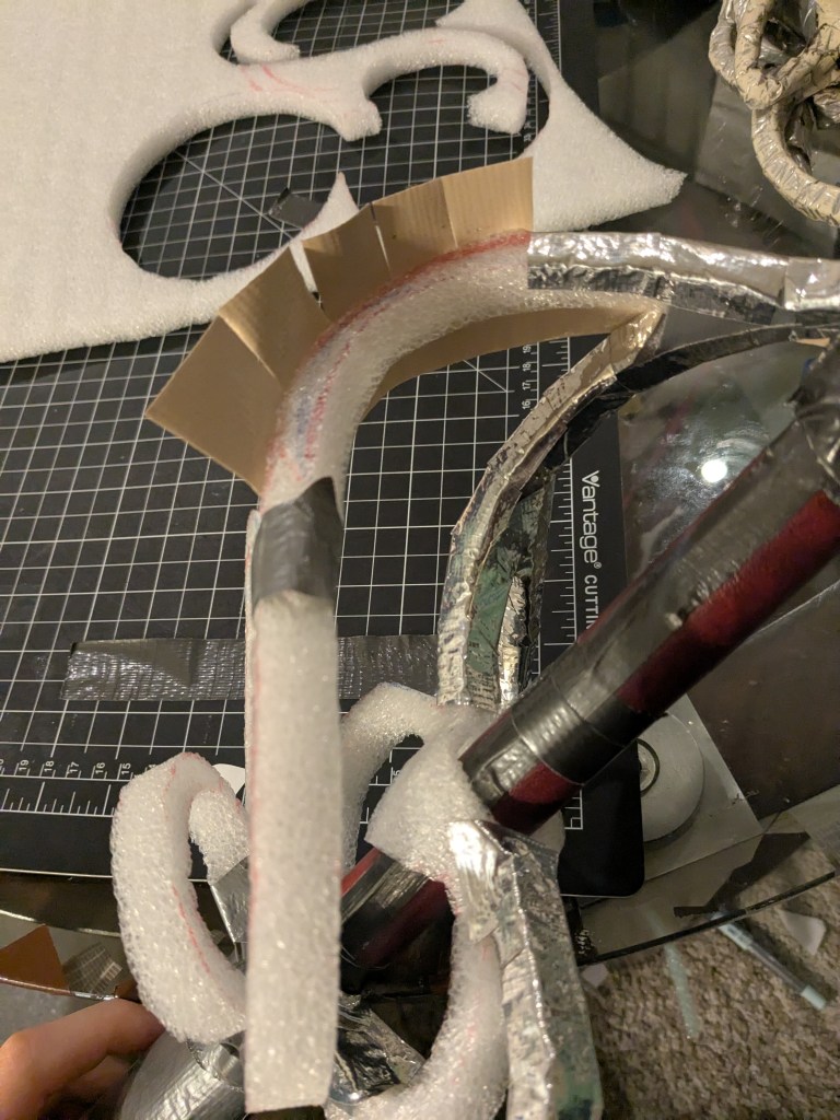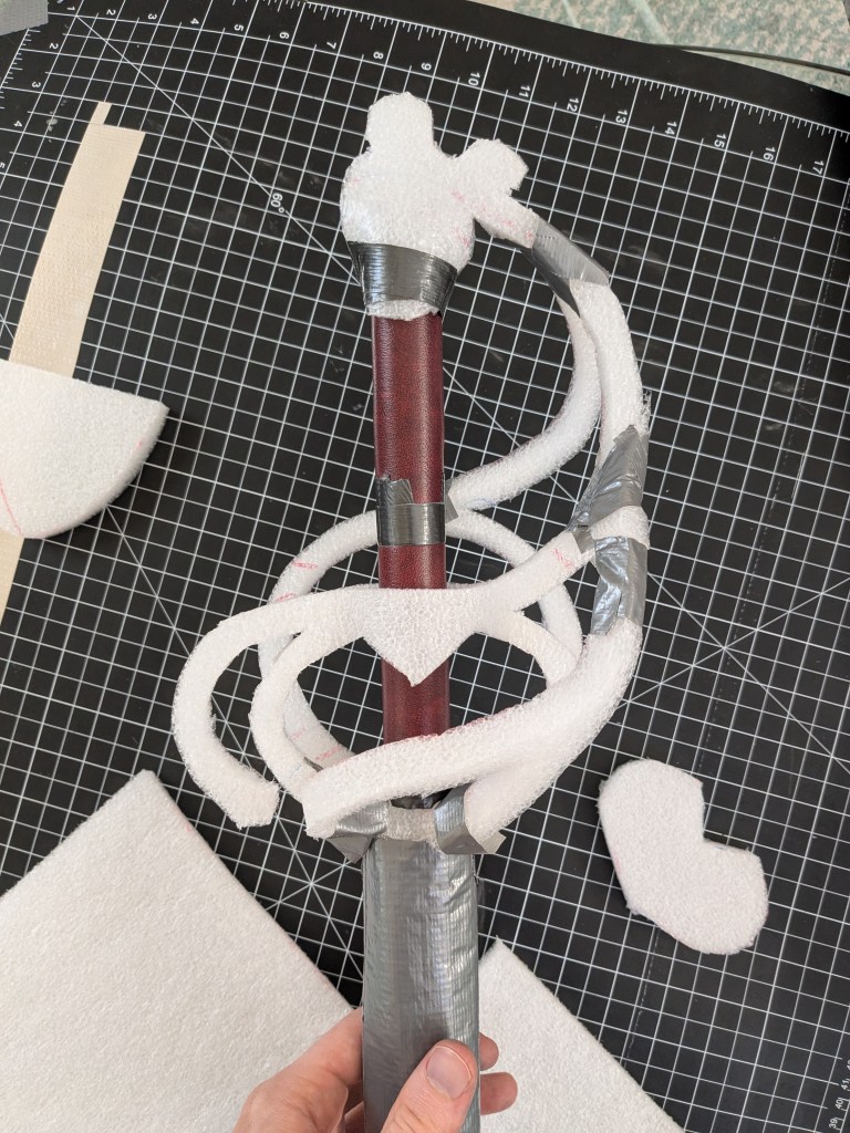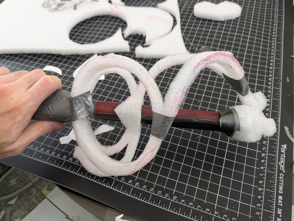 Fundamental principle used all over the place: note the duct tape is usually wrapped from the convex side of the curve, so that as tabs fold around the foam, they overlap to form a cohesive structure. For this handle, I used 2.2LB Density Polyethylene from Foam Factory.