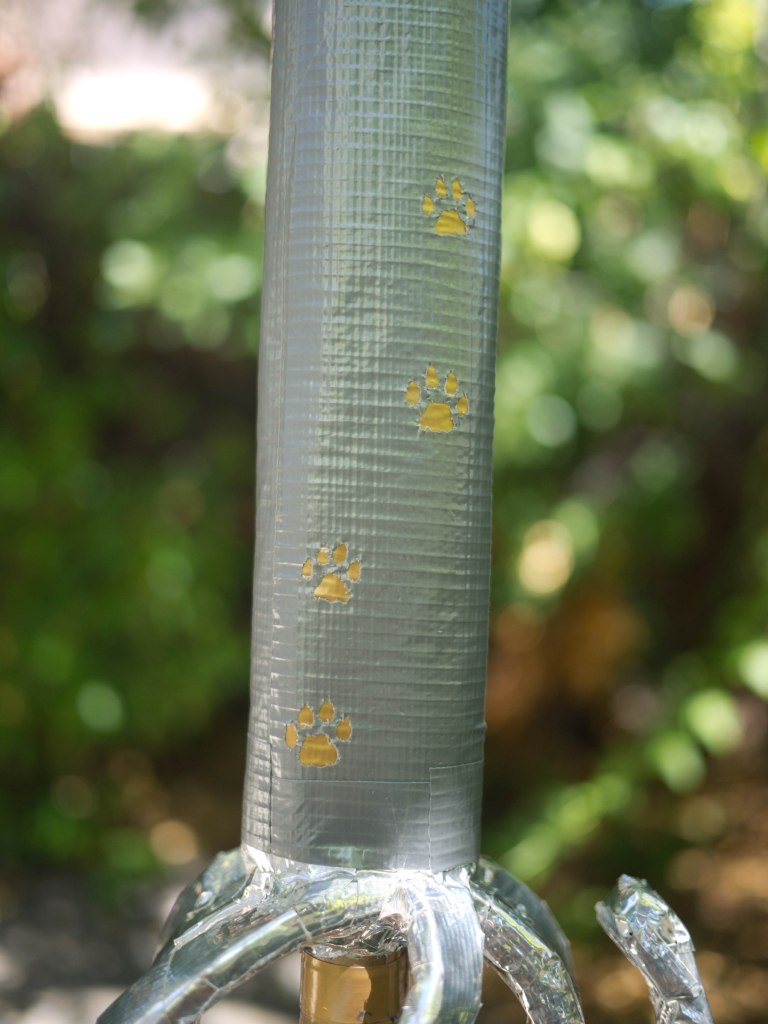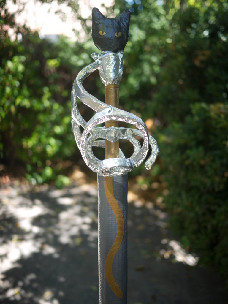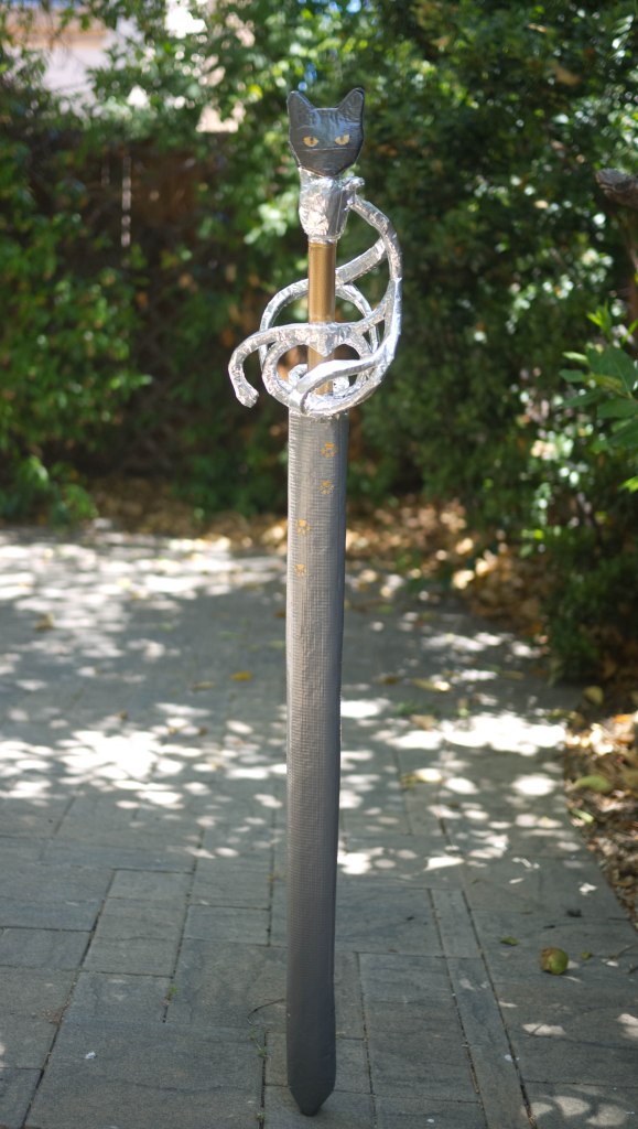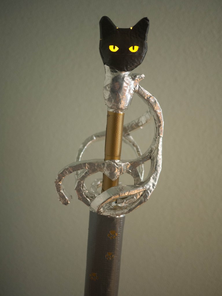 As a commission for a new LARPer who loves cats, I fashioned this sword with pawprints, cat’s tail, and a face/silhouette with glowing eyes!