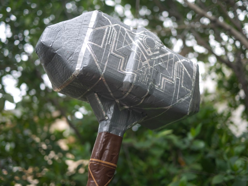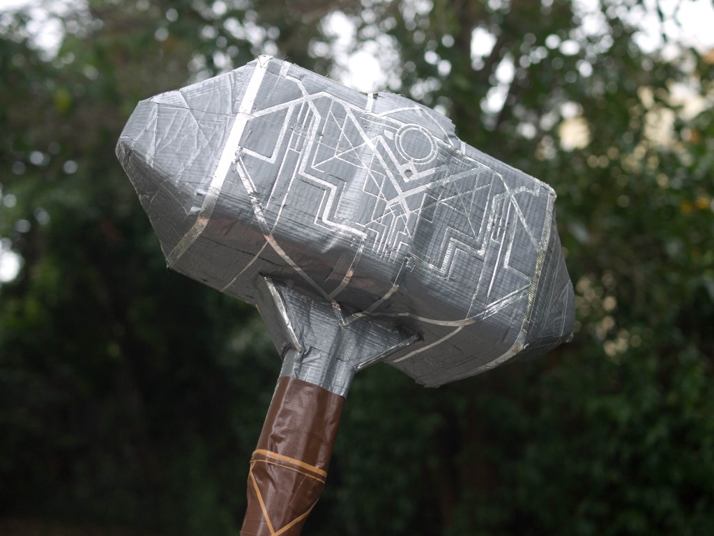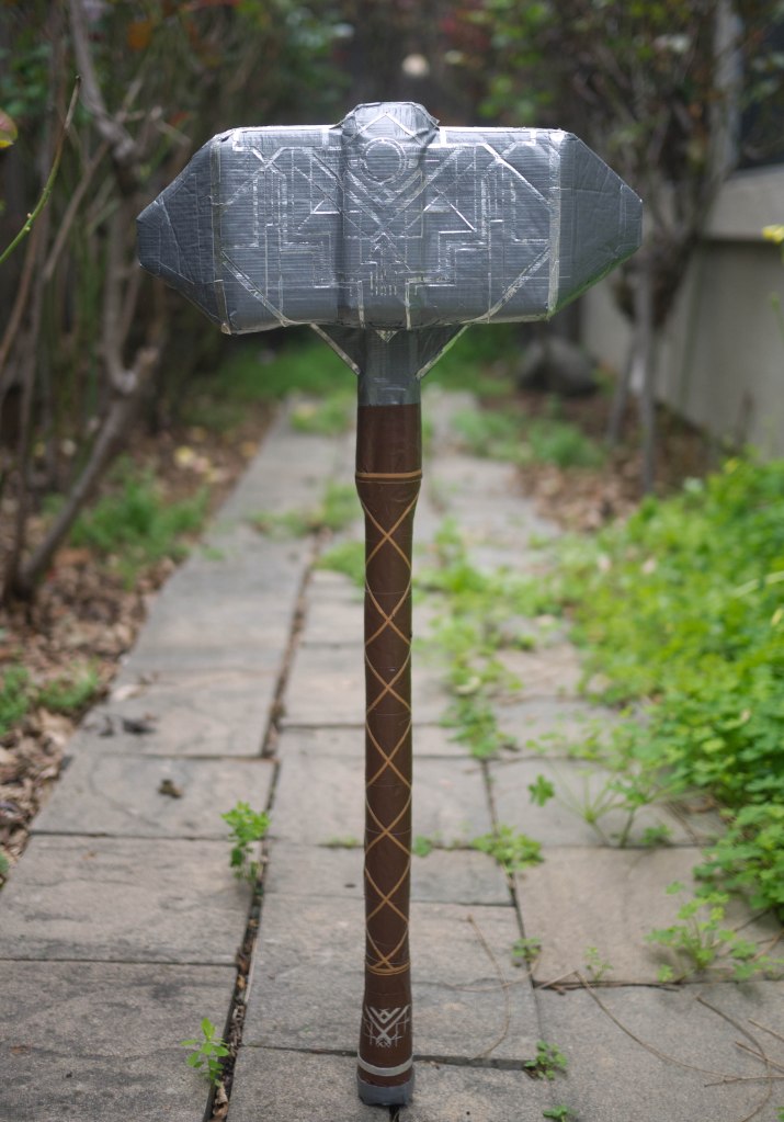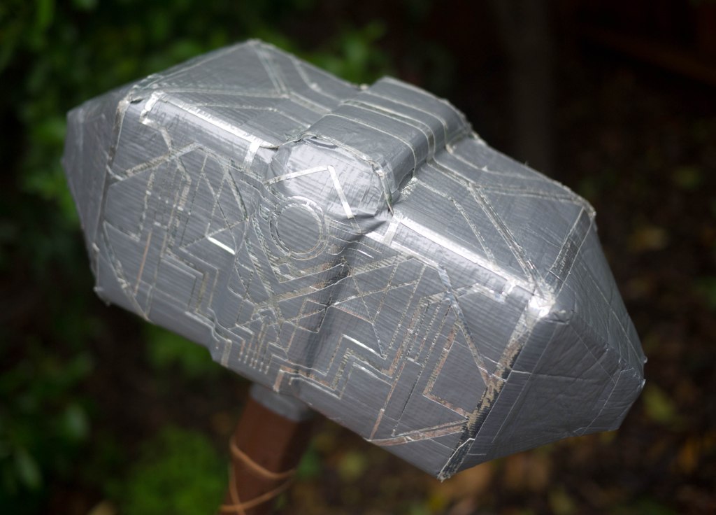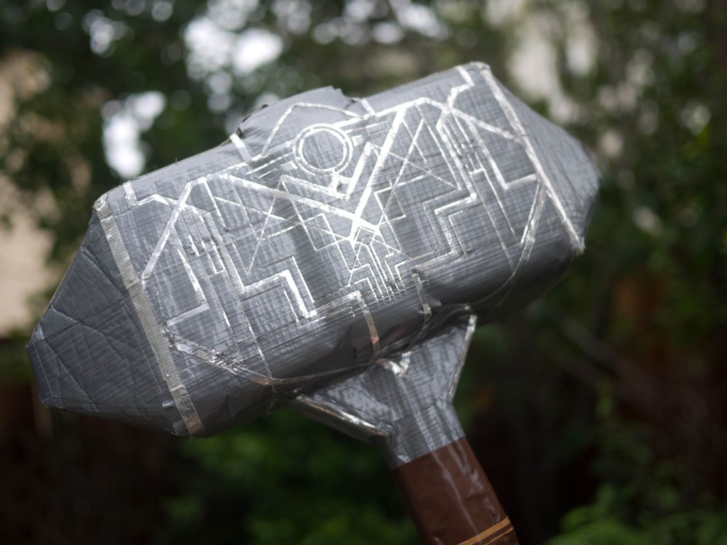 80% of the side surface (and the little silver emblem near the pommel) is done by digitally designing a vector file to input into the Cricut and then cutting those out, but everything else, including the tape on other surfaces of the hammer head, and along the rest of the handle, is done entirely by hand.