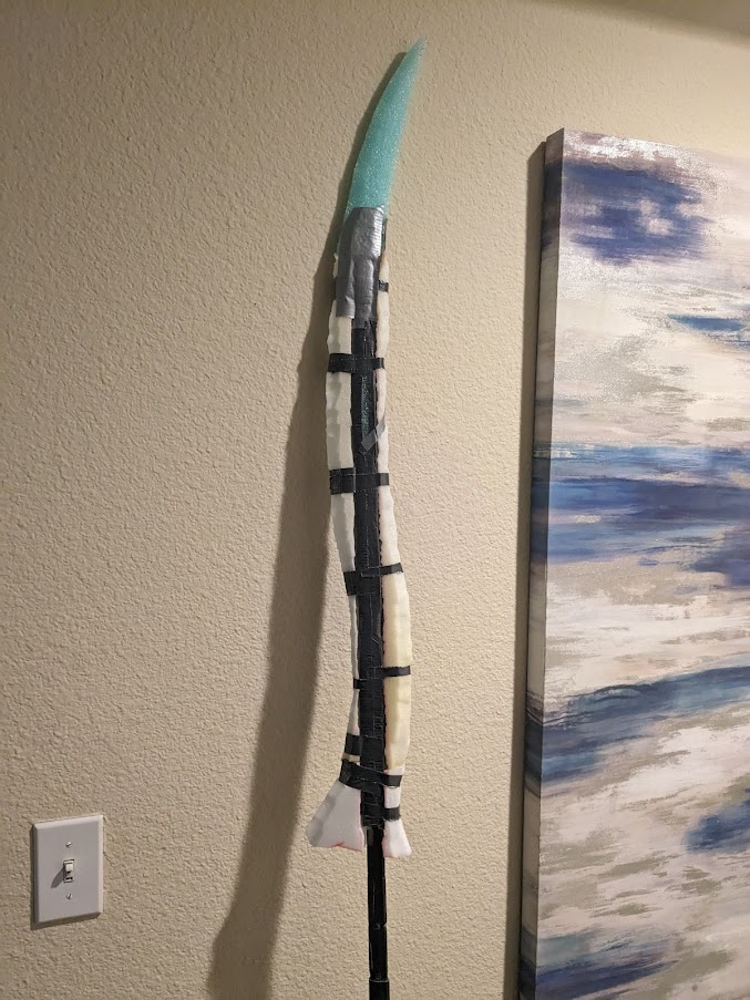 The solution is the Packing Foam (listed earlier) as a wrap around the exterior of the foam, which, when the boffer is not in contact with anything, maintains a nice structure so that the shape of the blade is maintained, and when the boffer hits something provides enough of a backing for the duct tape that you don’t have to worry about it gaining weird creases.