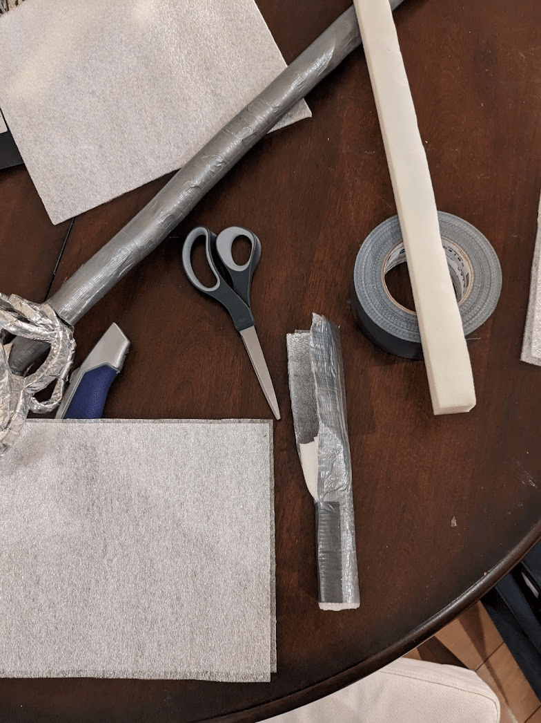 - A surrounding layer of thin closed-cell foam around the entire piece. This is really important component for several reasons, as it keeps all the inner foam in place and holds the duct tape in a consistent shape while allowing the blade to deform and spread out the force of the impact. It also adds to the padding, since it’s an additional layer of foam.