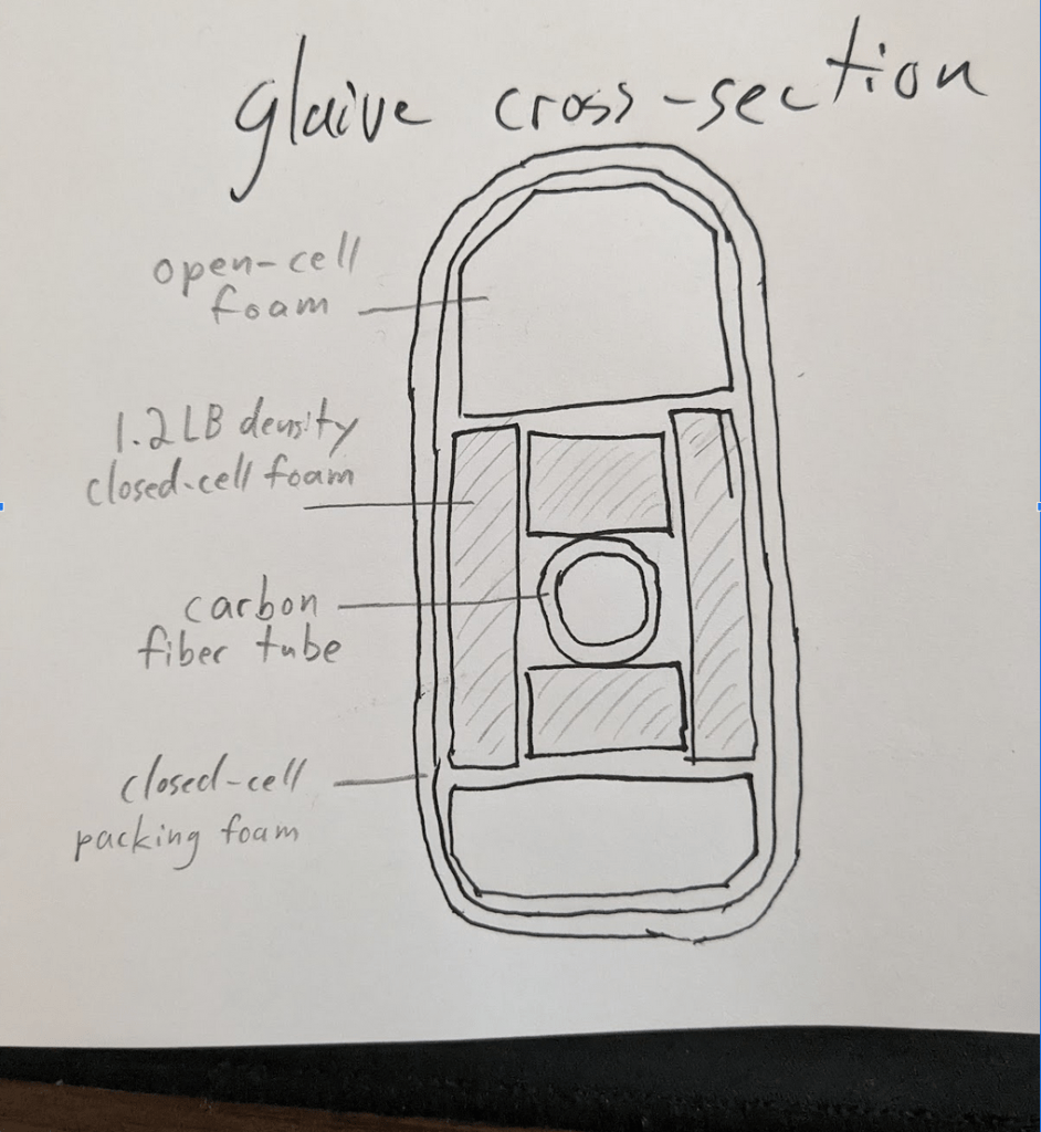 So for larger builds like glaives I’ve got a layer of closed-cell foam both against the inner core and at the edge, with lower-density open-cell foam filling the rest of the space. The result is a blade that is lighter, faster, and safer.