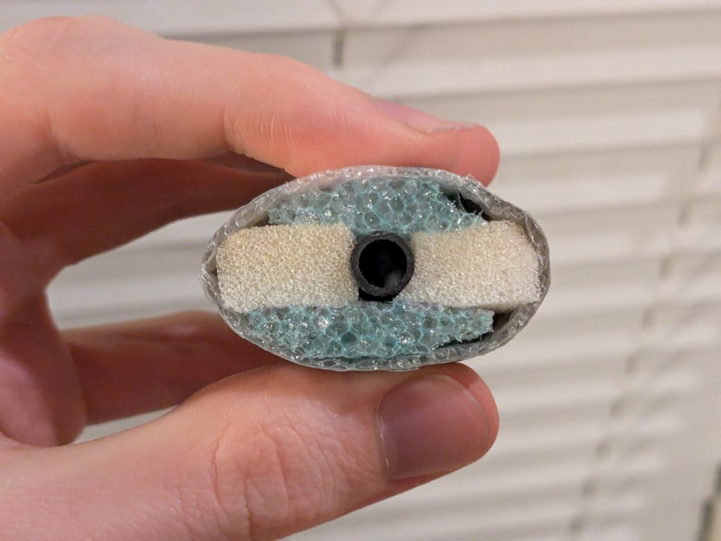 Alternately: If you’re someone whose style involves hitting harder, or if your boffer is going to be frequently hit by people who do, and you want the weapon to be a meter long, you might need to use different cores, or else it’ll eventually build up enough microfractures to risk breaking. A few options here. You could try solid 6mm or 8mm diameter rods rather than hollow tubes, although the added weight would necessitate more padding. Or you could use larger-diameter tubes to give some more structural stability, such as 10mm or 12mm, with, accordingly, some wider foam. Or you can use roll-wrapped tubes rather than merely pulltruded tubes, which may have greater ability to resist breaking force. Rock West Composites has options for this, although their website is pretty tricky to search through since only some of their tubes can be bought individually. I’ve tested their two-meter roll-wrapped tubes for polearms and they seem good, but the relatively inexpensive ones seem to now be out of stock.