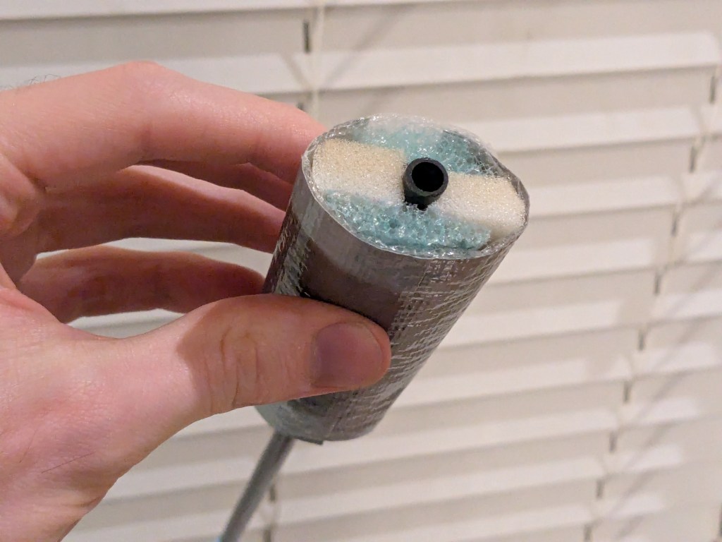 So, in theory you would want to use foam that is just stiff/dense enough that it fully decelerates the boffer. With light cores, this could mean purely using the squishy open-cell foam. In practice there are a couple of problems with that. The first is that duct tape will pinch itself and get all sorts of unpleasant creases if it’s put directly on top of squishy open-cell foam. The other is that if the boffer is heavy enough, you might want closed-cell foam up against the core just in case someone hits harder than you’re expecting.