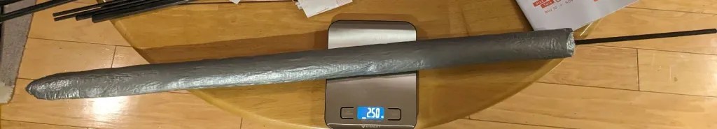 This works for these blades because they’re so light, the whole blade part of the boffer being a couple of ounces. The meter-long core is about one ounce by itself. With the blade added on, including all the layers of foam and the duct tape, it’s between 2.5 ounces and 3.5 ounces depending on how wide the blade is. See below, with the scale measuring in ounces:
