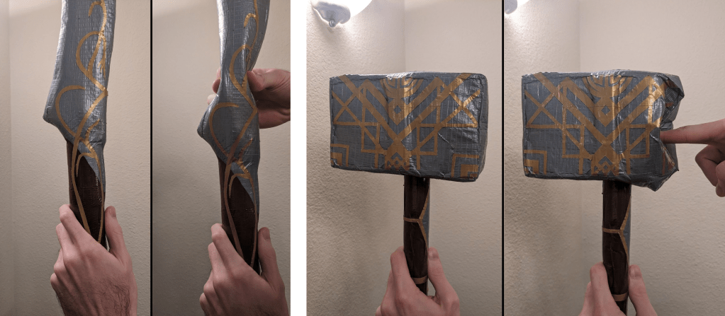 All the swords and sword-esque weapons are made with thin carbon-fiber tubes as cores, which I chose as the most lightweight material available to provide enough rigidity to have a satisfying structure. Around that is typically a layer of low-density closed-cell polyethylene foam for padding around the core. In my composite foam designs, there’s a layer of even-lower-density open-cell polyurethane foam for further squishability and lightness, surrounded by a thin layer of closed-cell foam.